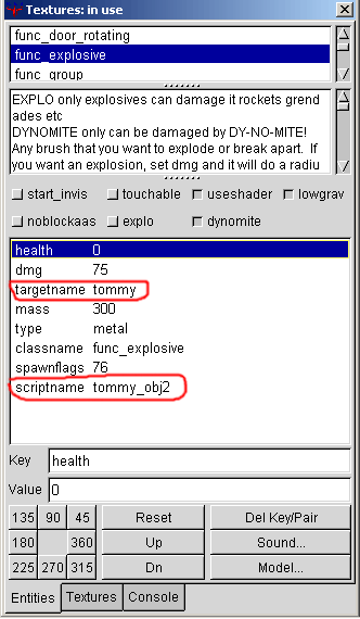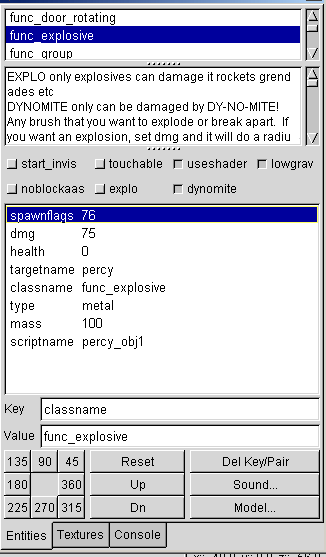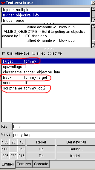 (Fig 1.7) As you can see ive added various keys, you need to add them in too, it doesnt matter what order they appear as long as you have those keys in, so lets discuss them: axis objective - this is set to ON, this actually means that only the ALLIED team will be able to blow this up, as its a axis objective, seems the wrong way round i know! but thats what it is scriptname percy_obj1 - this is what this trigger will look for in our script file that we will make later score 10 - this is how many points youll get when you blow this objective up spawnflags 1 - this has appeared because we chose "axis objective" which means only allies can blow it up target percy - this is our target for this trigger, once the dynamite blows up we want this trigger to be targeting our objective and blowing it up, our objective is called "percy" so thats what we give this a target of classname - automatically inserted, name of entity track percy target - this is what is displayed on screen to the players in game, before this "You are Near" is automatically inserted, ive written in "percy target". So it will say on screen "you are near percy target" when you go in the trigger brush area |